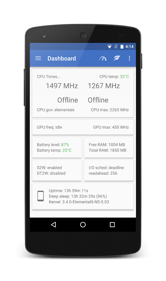 EX Kernel Manager (EXKM) is a premium kernel manager. It gives you total control over your hardware. EXKM has a beautifully optimized material design user interface. Works with all kernels and devices. Fully compatible with ElementalX Kernel.