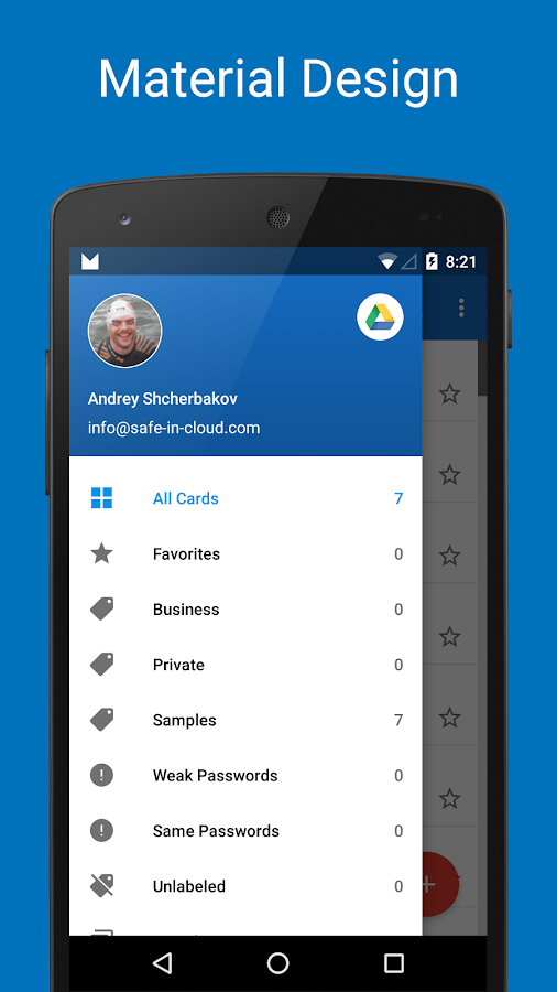 SafeInCloud was completely redesigned to match new Material Design user interface language by Google. In addition to the standard Light theme SafeInCloud also has a Dark theme option to help you saving a significant amount of battery life.