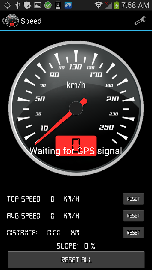 Displays you the speed on a racing-style gauge using GPS. It also records maximum speed, average speed, traveled distance and a current slope.