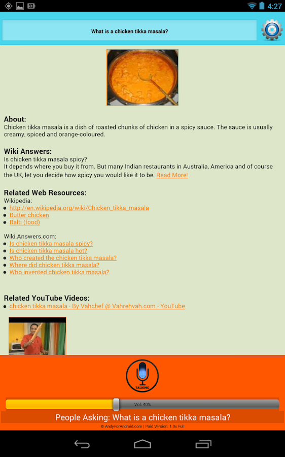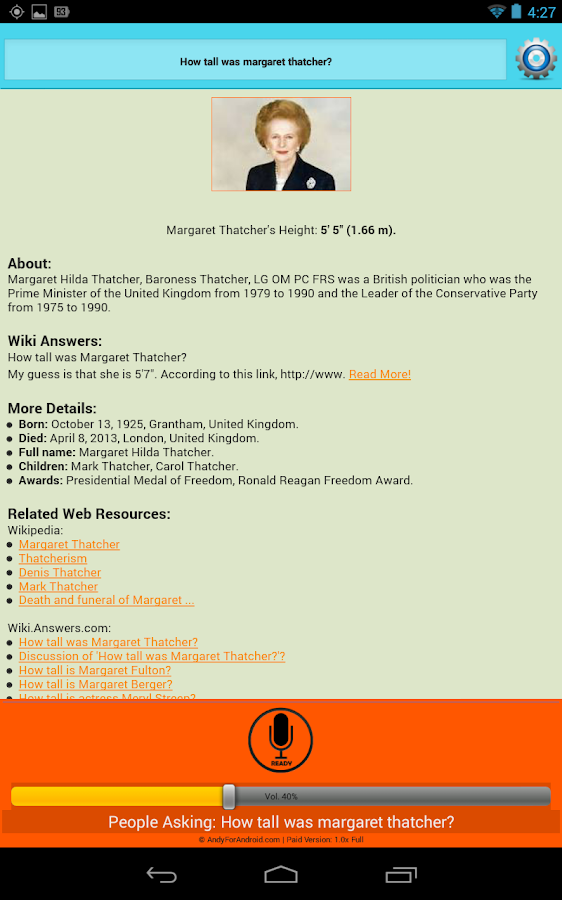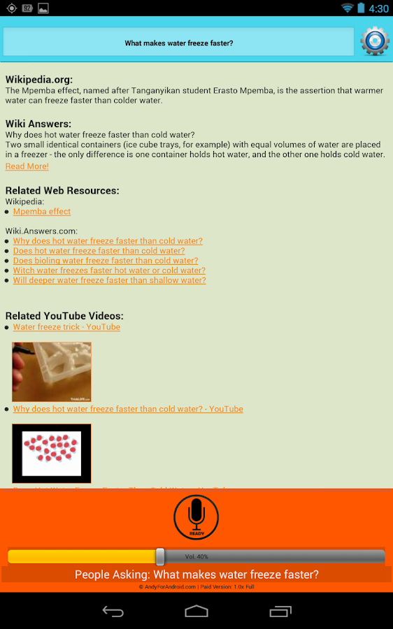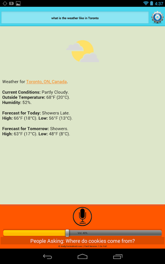 To ask a question or to give a command, tap the microphone button on the application home screen. Alternatively, you may give your device a little shake (this requires enabling the Shake Recording option) or simply just type your question manually to get the answer. Andy will recognize your voice and speech, search for the best possible answer and read it back to you in a clear voice. The answer will also be displayed on your device screen with additional details, including videos, urls and more description you can read if you feel like it.