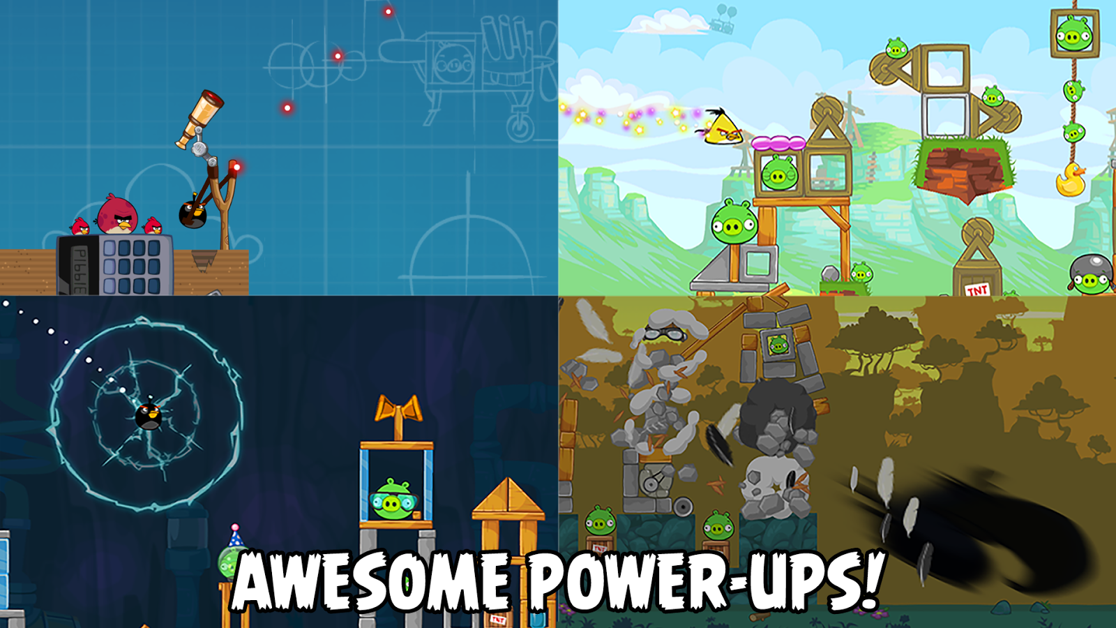 In addition to the Mighty Eagle, Angry Birds now has power-ups! Boost your birds’ abilities and three-star levels to unlock secret content! Angry Birds now has the following amazing power-ups: Sling Scope for laser targeting, King Sling for maximum flinging power, Super Seeds to supersize your birds, and Birdquake to shake pigs’ defenses to the ground!