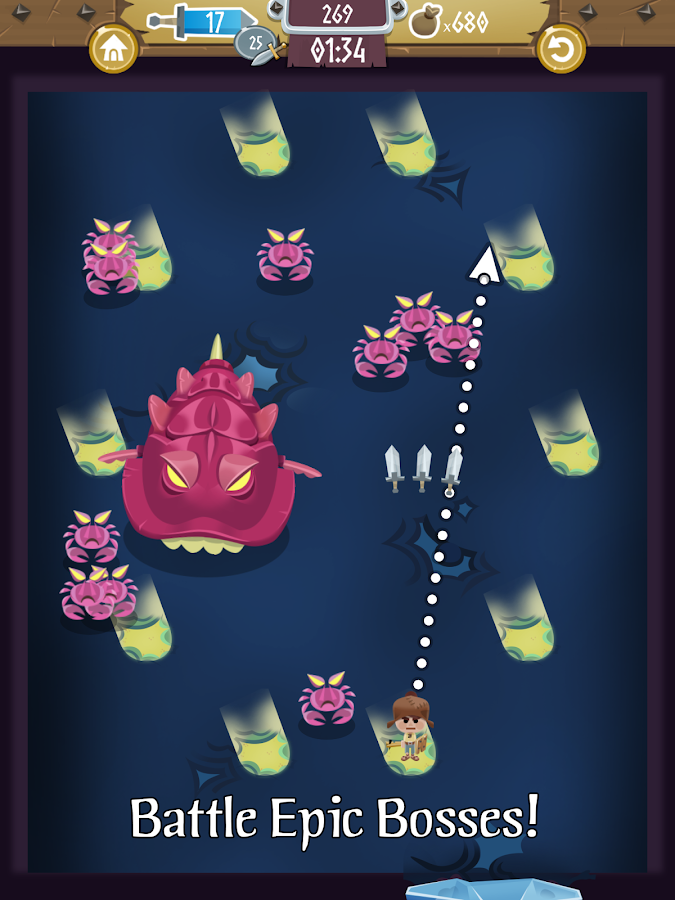 Point your hero where you want him to attack, and he won't stop moving until he's reached a safe zone or has died! The latter happens far too often... Pick up gear to increase your power, and kill weak enemies first so that you can level up enough to kill the stronger ones. Eventually, you may even become strong enough to kill a massive boss! Don't be disheartened by frequent deaths - it takes only moments to try again!
