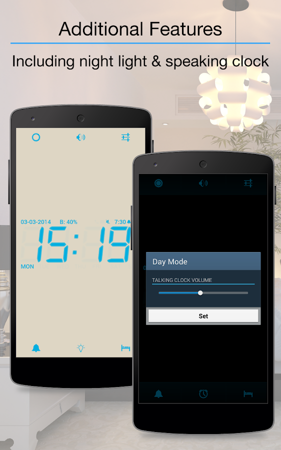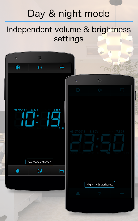 • Day & Night mode with individual brightness and volume settings