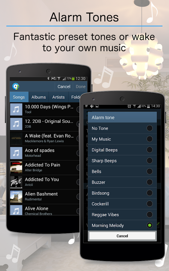 • Built in tones or wake to your own music