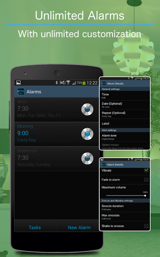 • Handy widget allows you to see the time in style on your homescreen and quickly access the alarms screen.