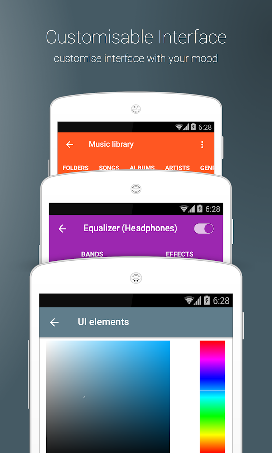 Change look and feel depending on your own style. Express yourself! To customize your interface tap options menu (small gear in the top right corner or menu button on your device). Then tap on Settings -> Look and feel -> “Colors and Background” or “Skins” to change whole look of the player.