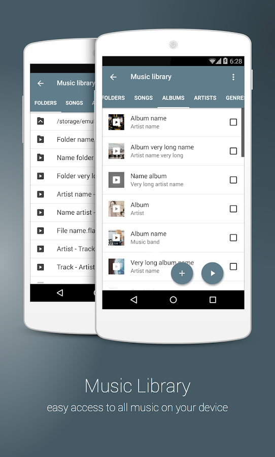 You can select tracks in 5 categories: folders, songs, albums, artists and genres. Add them all to playlist in one touch. There are no borders between directories and media library anymore. Just press ADD button on the left bottom corner. Then tap on checkboxes on the right side of any list item. When you select everything you want just press “Add” or “Play” button.