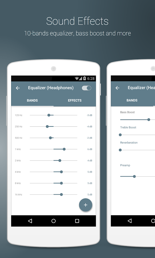 Get the best quality from your headphones using them with flexible effects. Open equalizer and swipe to the second tab with effects.