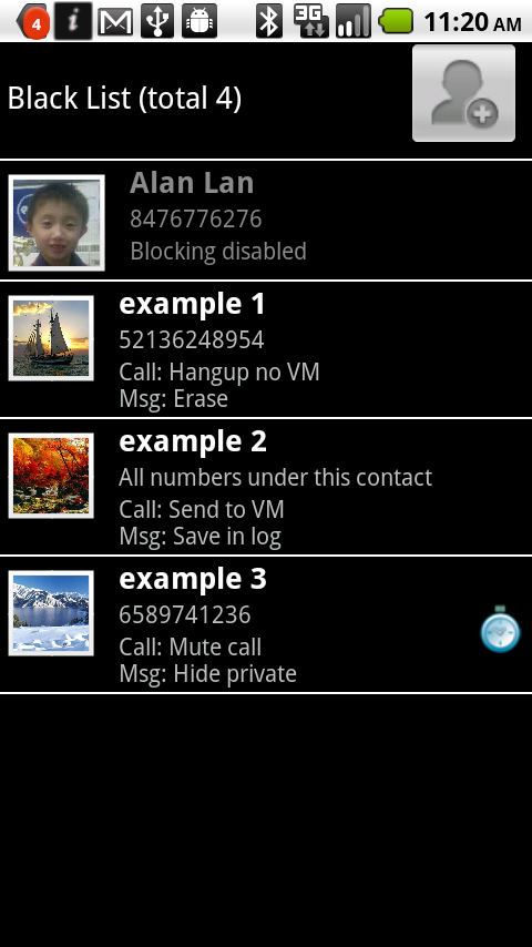 -Black list: Add individual numbers to be blocked, each number can be blocked in different ways, support timers to block based on day, hour and minute. Also block UNKNOWN, PRIVATE or other restricted numbers, and option to block all numbers not in contact book. Use wildcard match to block an area code. -Option to send auto text message reply to blocked calls and messages.