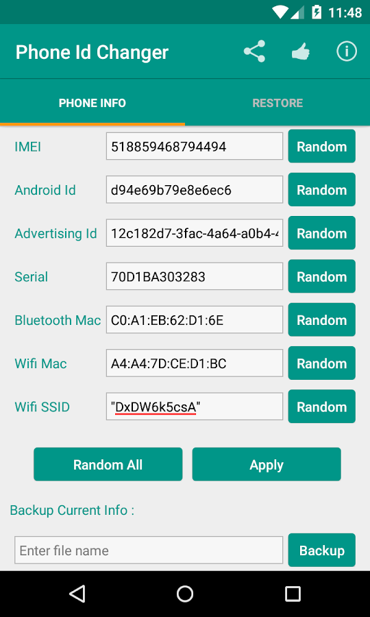 - Change the value of IMEI, Android Id, Serial Number( may not work with some devices), Wifi Mac Address and service set identifier (SSID) of the current wifi network.